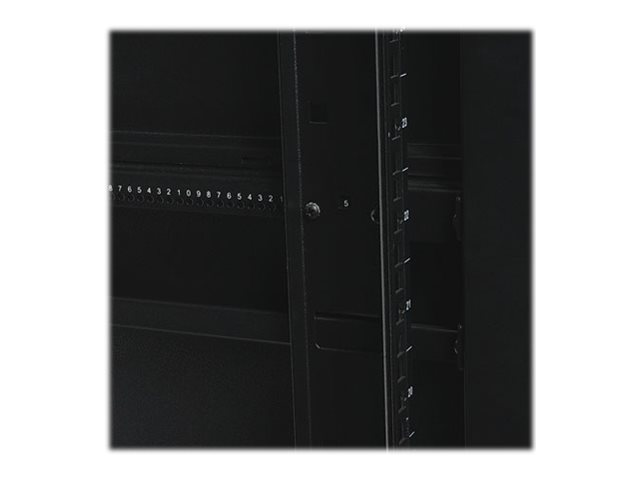 The SR42UBDP houses 1360 kgs (3000 lbs.) of standard 19-inch rack equipment in 42U. Its front and rear pairs of vertical rails have square mounting holes that are adjustable in quarter-inch increments from 4 to 42 inches. Adjustment is quick and an easy-view depth index ensures consistent rail placement without requiring time-consuming measurements. Each rack space within the enclosure is numbered for ready reference.