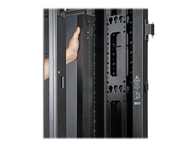 Two of the adjustable vertical mounting rails support toolless button-mount 0U installation of up to four compatible PDUs and cable managers. This feature makes it easier to route cabling to rack equipment and reduces cord clutter.