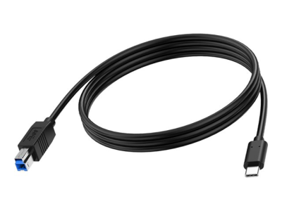 I den ene enden: USB C - plugges inn i den bærbare datamaskinen. Den mindre, vendbare USB-kontakten støtter USB versjon 3.1. I den andre enden: USB B - plugges inn i en ekstern enhet, for eksempel en skriver eller interaktiv skjerm. Støtter USB-versjon 3.0.